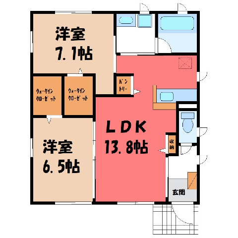 間取 / 専有面積 2LDK(S) / 64.12m2 間取り詳細 LDK13.8/洋室7.1/洋室6.5 築年月 2023年7月築